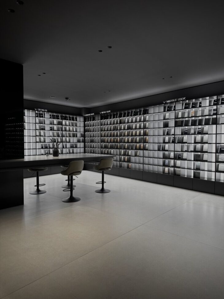 The 1,600 m² space transforms ceramic display into architecture, where material, light, and spatial narrative redefine the traditional tile showroom.