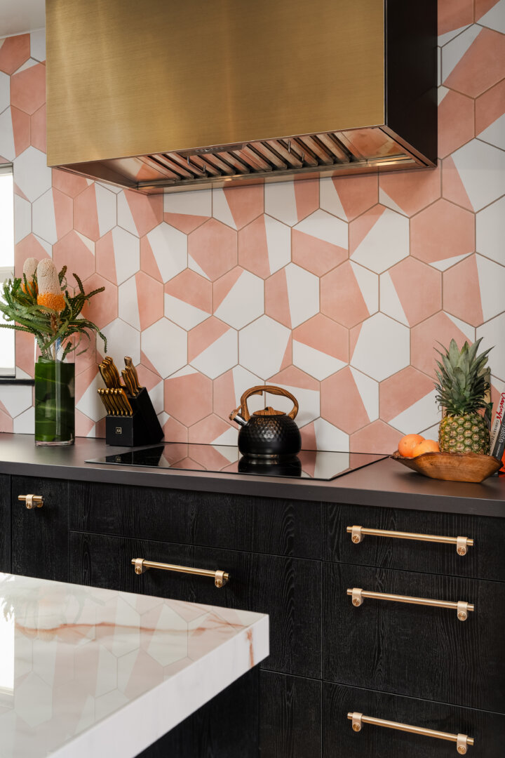 These touches layer seamlessly with other standout features: pink-and- white geometric tile that energizes the space, and a terracotta-veined Dekton countertop on the island that acts as both anchor and statement piece. Durability was another guiding principle, leading him to choose a Ruvati Gunmetal undermount sink and Buster + Punch faucet—fixtures selected for their long-lasting performance as much as their design appeal.