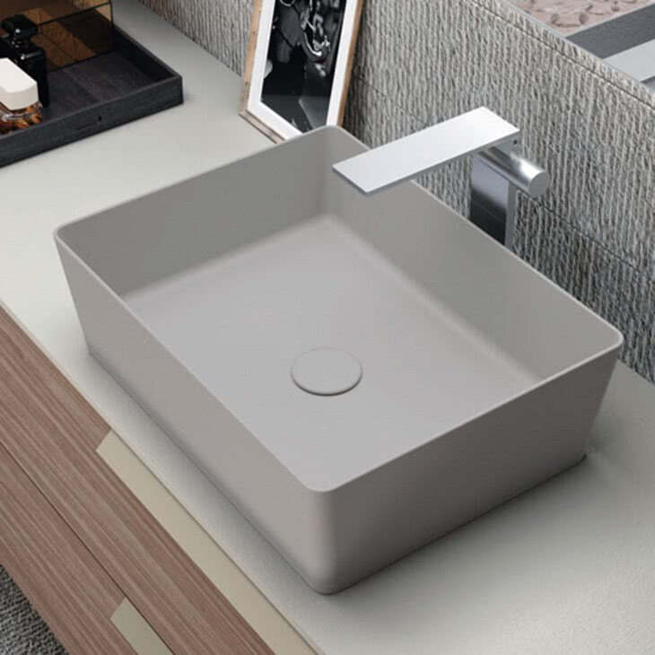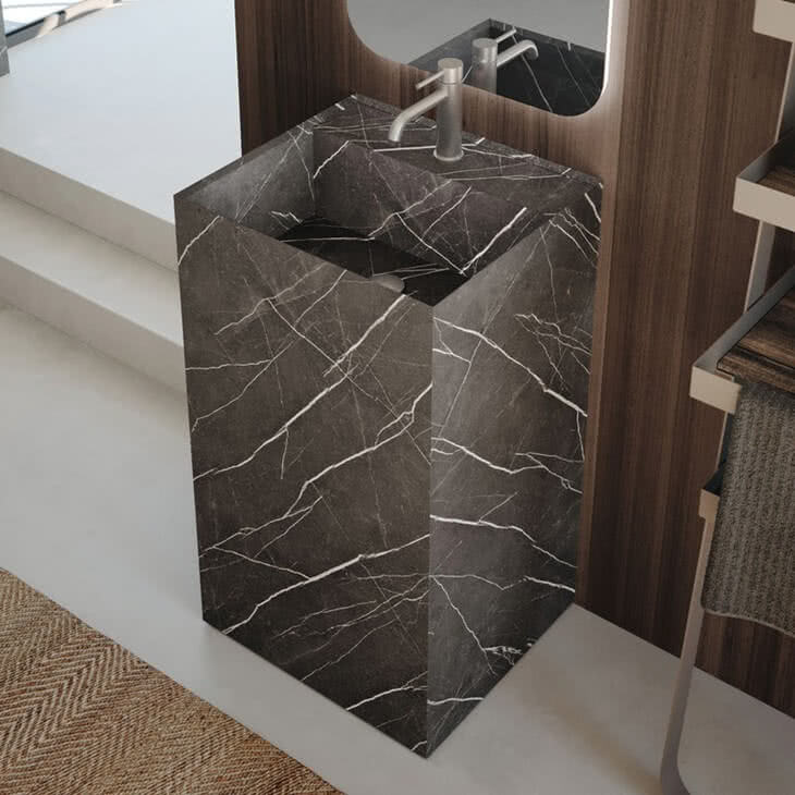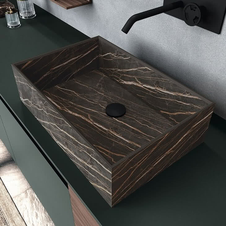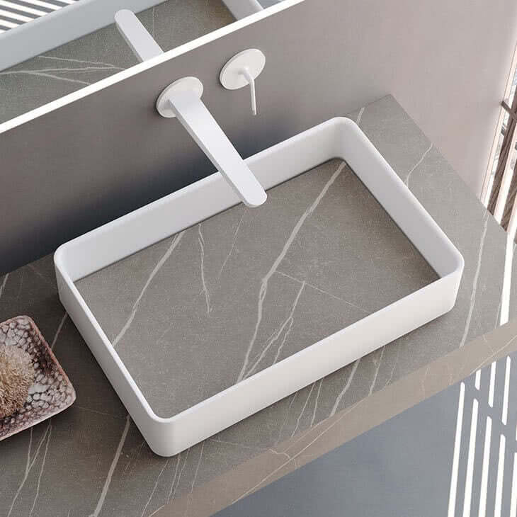 Available in a Stone-look or Marble-look finish in HPL or Porcelain, Modo basins are elegance personified.