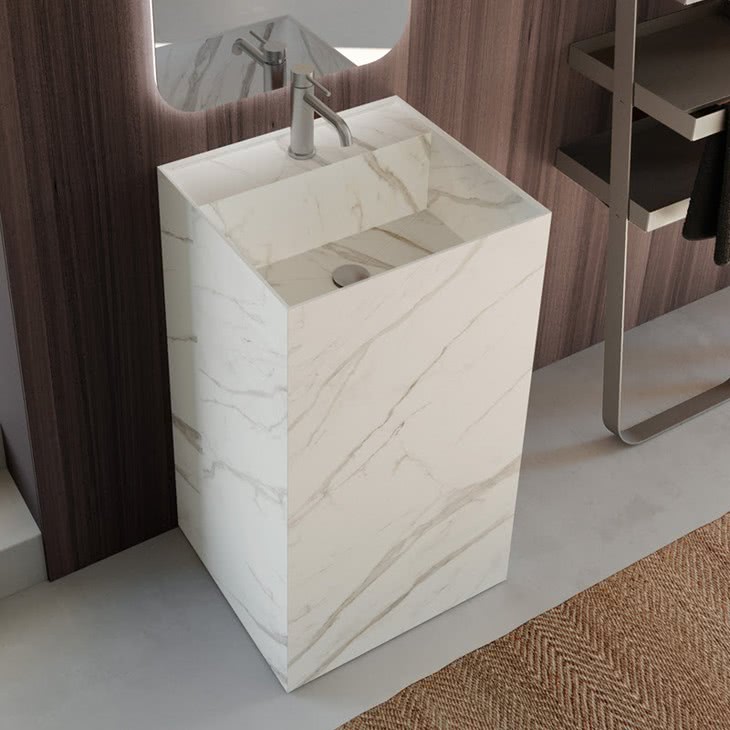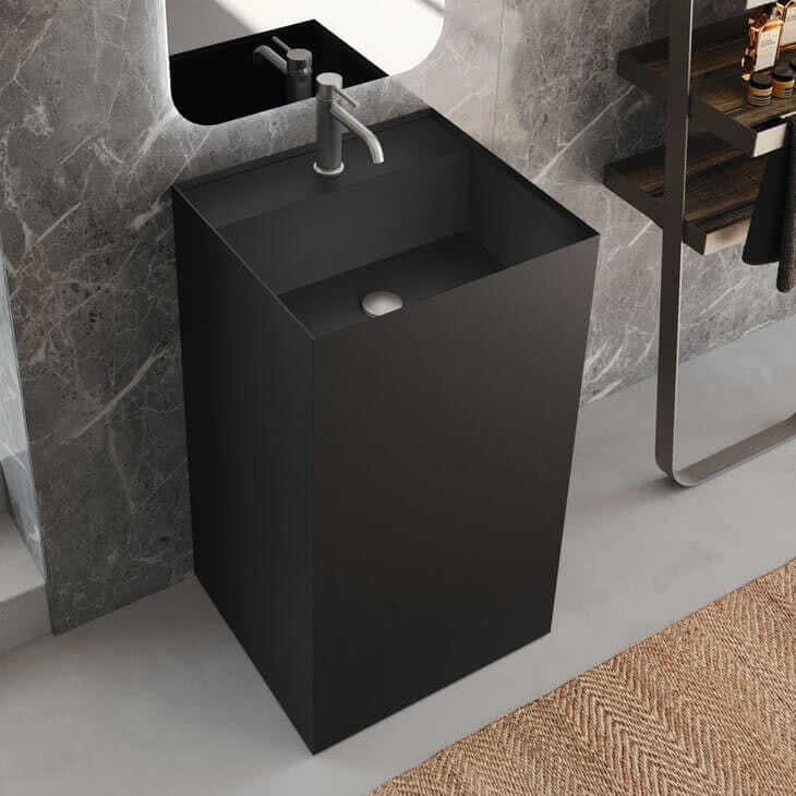 With 20 available finishes, the Urban Kant Pedestal basins are designed to suit almost any contemporary bathroom design and are available for use with deck or wall-mounted faucets. Available in seven Stone-look Porcelain finishes, eight Marble-look Porcelain finishes, three HPL finishes, and Matte White or Matte Black Corian Solid Surface.
